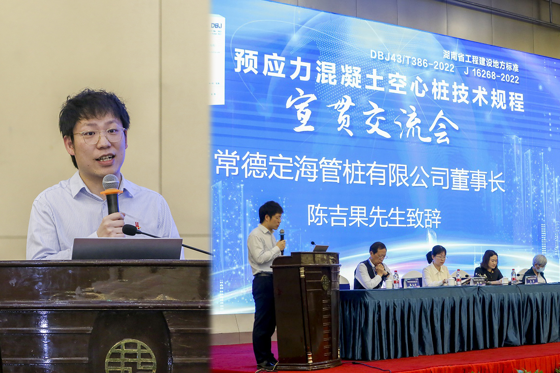 第二個(gè)方面表達(dá)了承辦方所做的工作與期盼:常德定海管樁公司是湖南省三家最早生產(chǎn)高強(qiáng)預(yù)應(yīng)力混凝土管樁企業(yè)之一。2008年3月第一批管樁產(chǎn)品進(jìn)入市場(chǎng)至今已有16年的歷程。感謝在座的各位大師的支持、厚愛(ài),企業(yè)也得到了長(zhǎng)足發(fā)展,定海將著力于高性能、高強(qiáng)度、綠色化、低碳排混凝土材料及結(jié)構(gòu)件的研發(fā)推廣應(yīng)用。定海管樁與蘇州混凝土與水泥制品研究院、嘉興學(xué)院、湖南文理土木學(xué)院有著長(zhǎng)期的技術(shù)協(xié)作。同時(shí)也取得了多項(xiàng)技術(shù)專利又無(wú)償奉獻(xiàn)給社會(huì),來(lái)推動(dòng)我們這個(gè)行業(yè)的發(fā)展盡一份力。定海管樁公司也參與了多項(xiàng)團(tuán)體標(biāo)準(zhǔn)、行業(yè)標(biāo)準(zhǔn)的編制工作。陳克學(xué)先生也全程參與了GB13476高強(qiáng)預(yù)應(yīng)力混凝土管樁國(guó)家標(biāo)準(zhǔn)和10G409國(guó)標(biāo)圖集的修訂,新修訂的國(guó)家標(biāo)準(zhǔn)和圖集將在往后一段時(shí)間執(zhí)行。宣貫的湖南省工程建設(shè)地方標(biāo)準(zhǔn),預(yù)應(yīng)力混凝土空心樁技術(shù)規(guī)程,產(chǎn)品多樣,應(yīng)用領(lǐng)域更加廣泛,施工工法不斷創(chuàng)新。有用于基坑支護(hù)的PRC高強(qiáng)、超高強(qiáng)混凝土管樁。有用于樁基工程的高強(qiáng)和超高強(qiáng)管樁與方樁。有用于地基加固用的預(yù)制豎向勁性體C60管樁。預(yù)制樁廣泛適用于全省的工業(yè)與民用建筑、市政工程、水利工程、高速公路、鐵路工程的各個(gè)領(lǐng)域。在此也真誠(chéng)地期盼:期盼地勘大師們通過(guò)今天的宣貫,重新定義了預(yù)制產(chǎn)品的多樣性,施工工法的創(chuàng)新性,各種地質(zhì)條件的適應(yīng)性。單位Kpa成本相對(duì)其它灌注樁更經(jīng)濟(jì),施工環(huán)境友好,現(xiàn)場(chǎng)文明衛(wèi)生的特點(diǎn)。期盼地勘大師對(duì)樁基選型匹配時(shí)優(yōu)先選用。欣慰的是,結(jié)構(gòu)設(shè)計(jì)大師們對(duì)預(yù)制樁在全省推廣應(yīng)用做了大量的工作,千分感謝,又萬(wàn)分期待有更多的應(yīng)用。從預(yù)制產(chǎn)品成為樁基要感謝施工方,預(yù)制樁及結(jié)構(gòu)件分會(huì)劉輝會(huì)長(zhǎng)對(duì)湖南省域使用預(yù)制樁要解決的痛點(diǎn)是打不下去的問(wèn)題,所以研發(fā)出了更多新的施工工法。一個(gè)有經(jīng)驗(yàn)的承包商關(guān)注的是優(yōu)質(zhì)產(chǎn)品在應(yīng)用中的盈利能力。辦法是有的,只有通過(guò)共建生態(tài)就一定能實(shí)現(xiàn)。